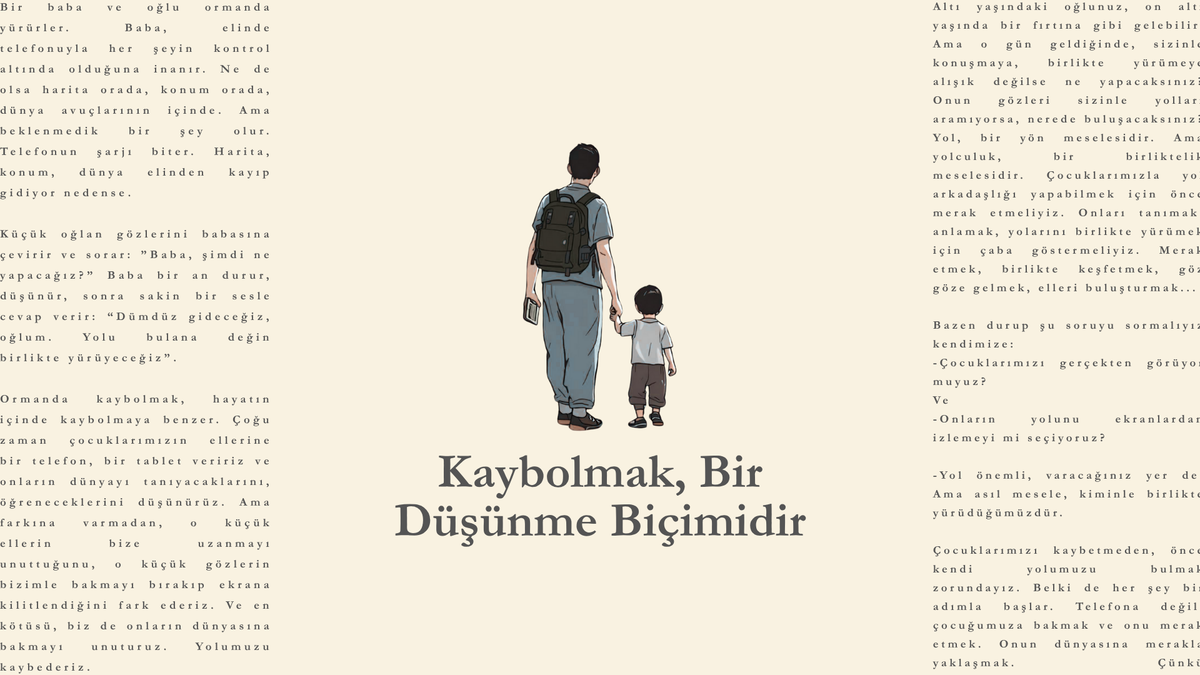 Bir baba ve oğlu ormanda yürürler. Baba, elinde telefonuyla her şeyin kontrol altında olduğuna inanır. Ne de olsa harita orada, konum orada, dünya avuçlarının içinde. Ama beklenmedik bir şey olur. Telefonun şarjı biter. Harita, konum, dünya elinden kayıp gidiyor nedense. Küçük oğlan gözlerini babasına çevirir ve sorar: ”Baba, şimdi ne